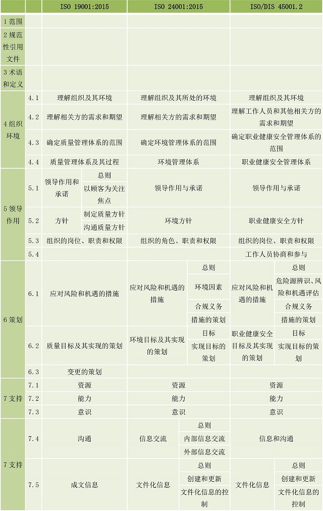 在國內(nèi),組織都是將各個(gè)管理體系進(jìn)行整合,質(zhì)量、環(huán)境、職業(yè)健康安全管理體系作為ISO標(biāo)準(zhǔn),均使用了高階結(jié)構(gòu),為體系的整合提供了便利。表2將三個(gè)體系的框架進(jìn)行了對應(yīng)于合并,可供讀者參考。
